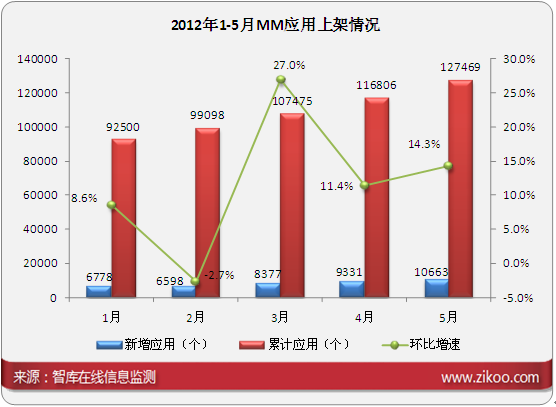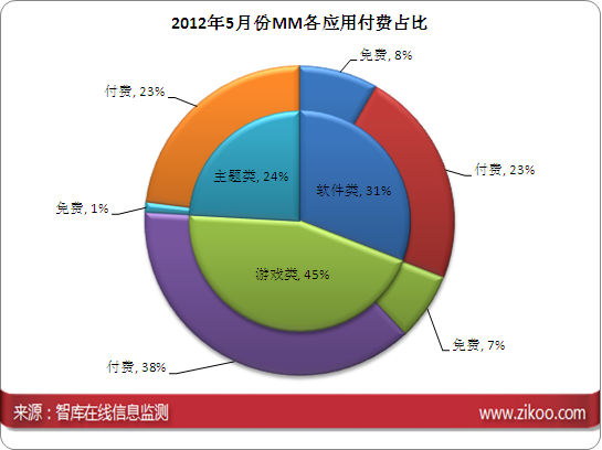 据智库在线统计,截至2012年5月底,中国移动应用商店MM上架产品总数127469个,其中应用软件33423个,游戏29680个,主题64366个。主题类应用还是占据了绝对多的数量。