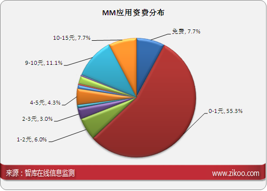 在资费方面,其中7.7%为免费应用,92.3%为收费应用。近年来免费的应用逐渐减少,收费的主要集中在0-1元、1-2元、9-10元几个区间,其中0-1元区间的应用产品比例较大,这个区间主要以主题类应用为主,9-10元区间则以游戏类应用为主。
