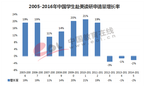 美国研究生委员会发布的《2015 CGS国际研究生招生情况调查报告》显示,2014-2015年度中国内地赴美读研申请增长率为-2%,连续3年负增长。
