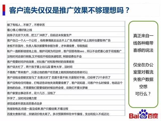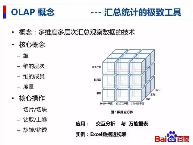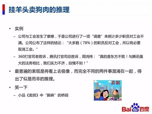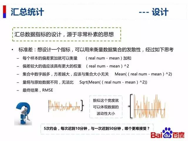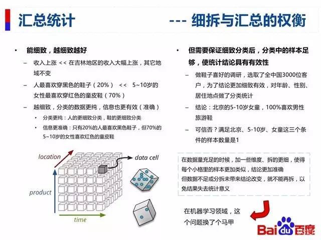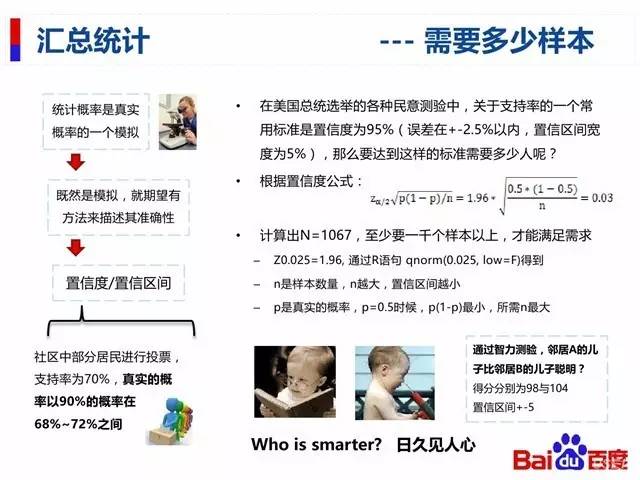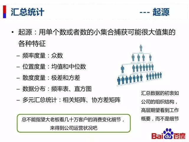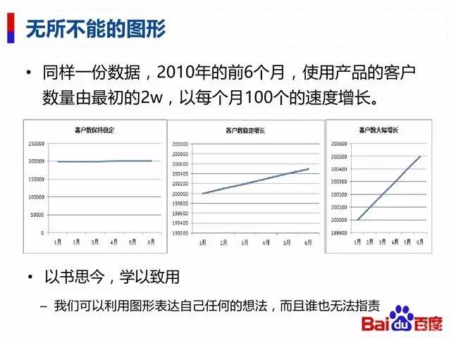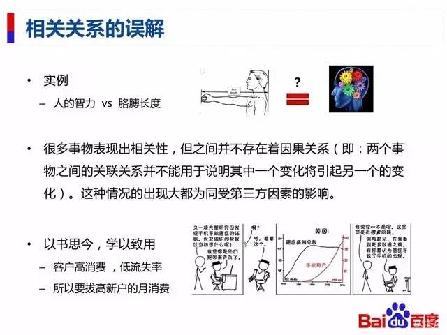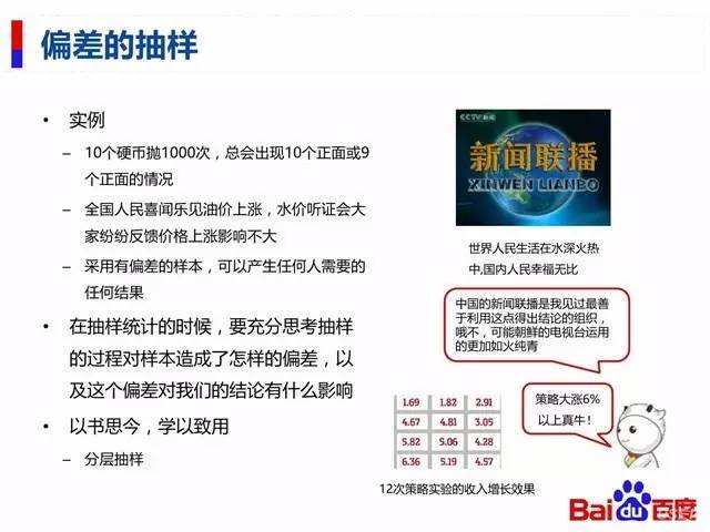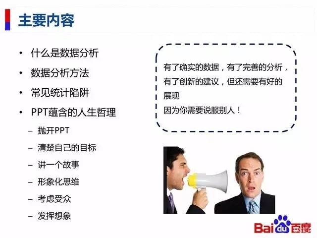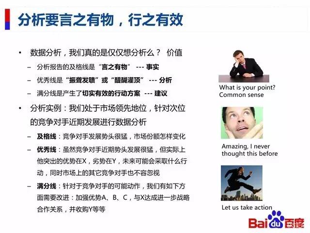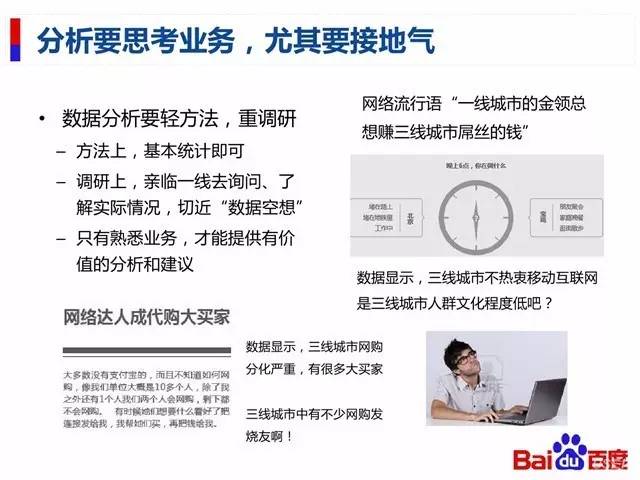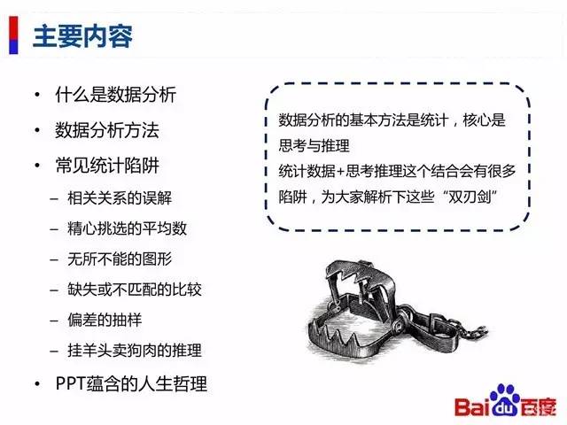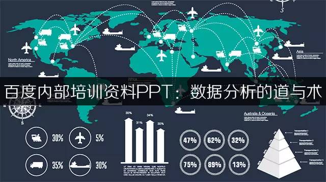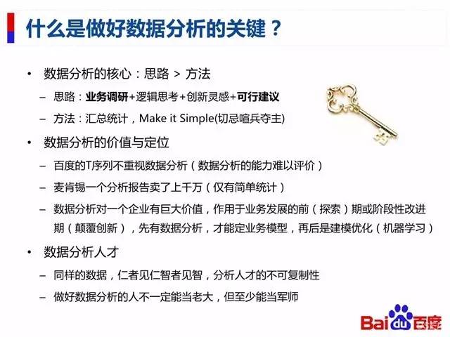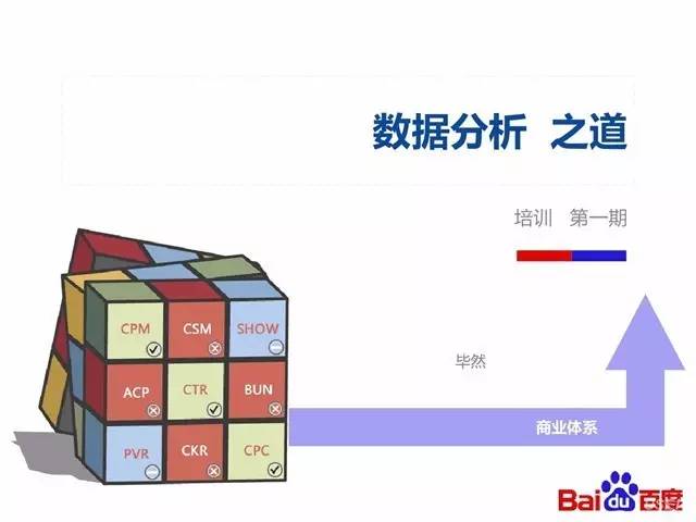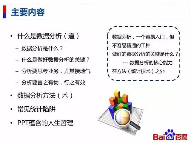 百度内部PPT: 数据分析的道与术 这是一个来自百度内部培训关于数据分享的、阅读类的PPT,文字说明非常充分,适合刚入门数据分析的朋友进行学习。 主要内容: 1、什么是数据分析(道) 1.1 数据分析是什么? 1.2 什么是做好数据分析的关键? 1.3 分析要思考业务,尤其是接地气 1.4 分析要言之有物,行之有效 2、数据分析方法(术) 3、常见的统计陷阱 4、PPT蕴含的人生哲理 来自:36大数据 更多阅读:埃森哲是如何系统化做好数据分析中美企业在数据分析上的最大差异:增长黑客的实践一份优秀的数据分析报告应该这样写数据分析中6个常规的错误在活动效果评估时防止掉入对照组不具代表性的陷阱老用户召回套路这么多,为什么留存率这么差2017年数据分析行业发展趋势四年不间断数据分析告诉我们的四个经验教训详解数据分析的一般步骤及业务分析方法从零开始数据分析:一个数据分析师的数据分析流程酷传:2015年8月电影APP数据分析知微:618电商大促微博营销效果数据分析中国花卉协会:2018年我国花卉进出口数据分析报告从数据中分析三大品牌的社会化品牌塑造5月份被投资的19家数据分析服务企业