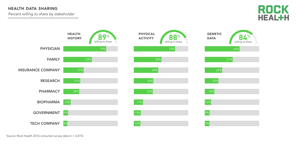 5.虽然消费者关心他们健康数据的隐私和安全,绝大多数(77%)有兴趣分享他们的健康信息,特别是得到他们医生更好的照顾。