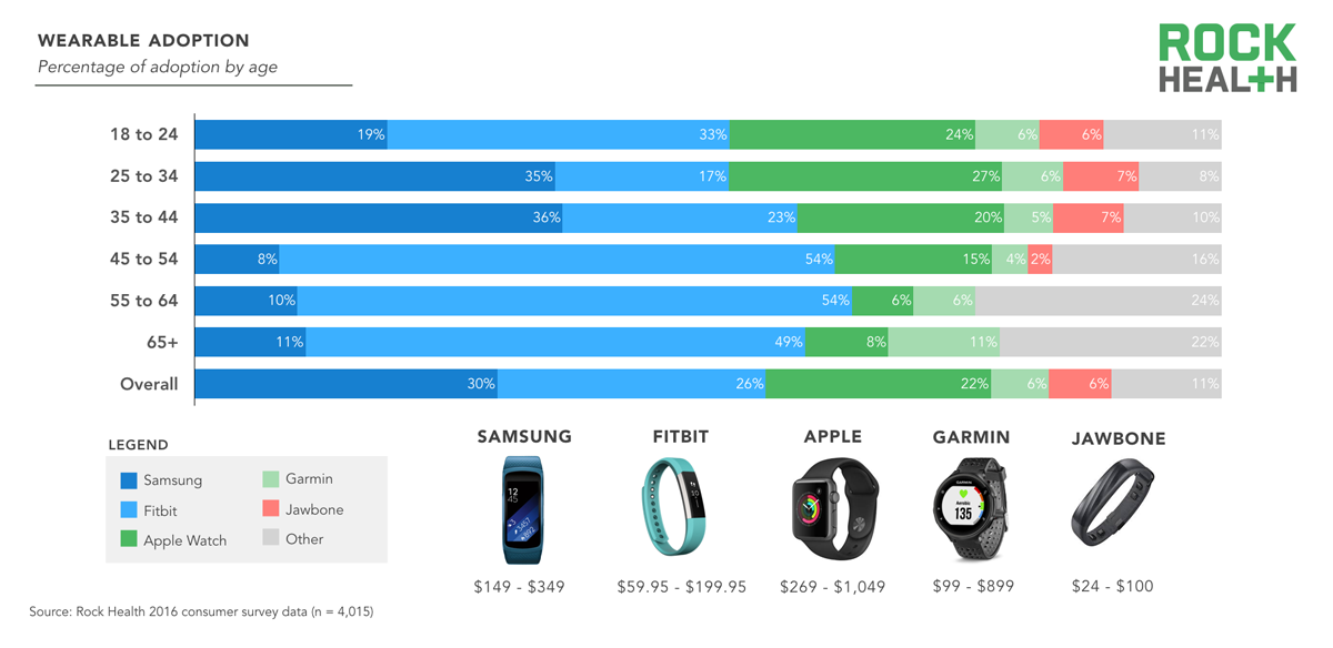 17.最受欢迎且适应所有年龄段的可穿戴设备制造商是三星(30%),Fitbit(26%)和苹果(22%)。