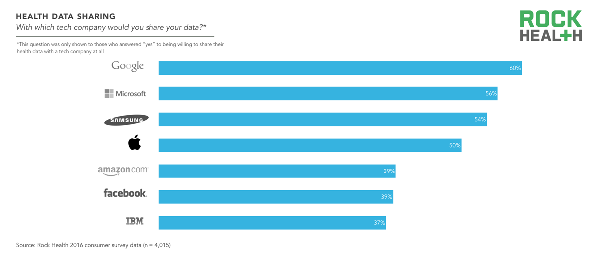 10.尽管在数字健康涉及领域不同,Google一直是这个领域最值得信赖的技术公司。 另一方面,社交媒体巨头Facebook和Watson的创造者 IBM是最不值得信赖的技术公司。