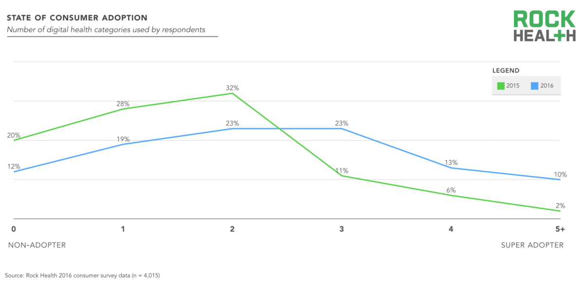 1.数字健康在2016年达到了临界点,因为消费者在过去12个月中采用了创纪录的数字健康工具。46%的消费者现在被认为是积极的数字健康使用者,使用了三种或更多类别的数字健康工具(例如远程医疗、可穿戴设备),而2015年数据只有19%。只有12%的美国人是非采用者,相比2015年的20%,明显下降。