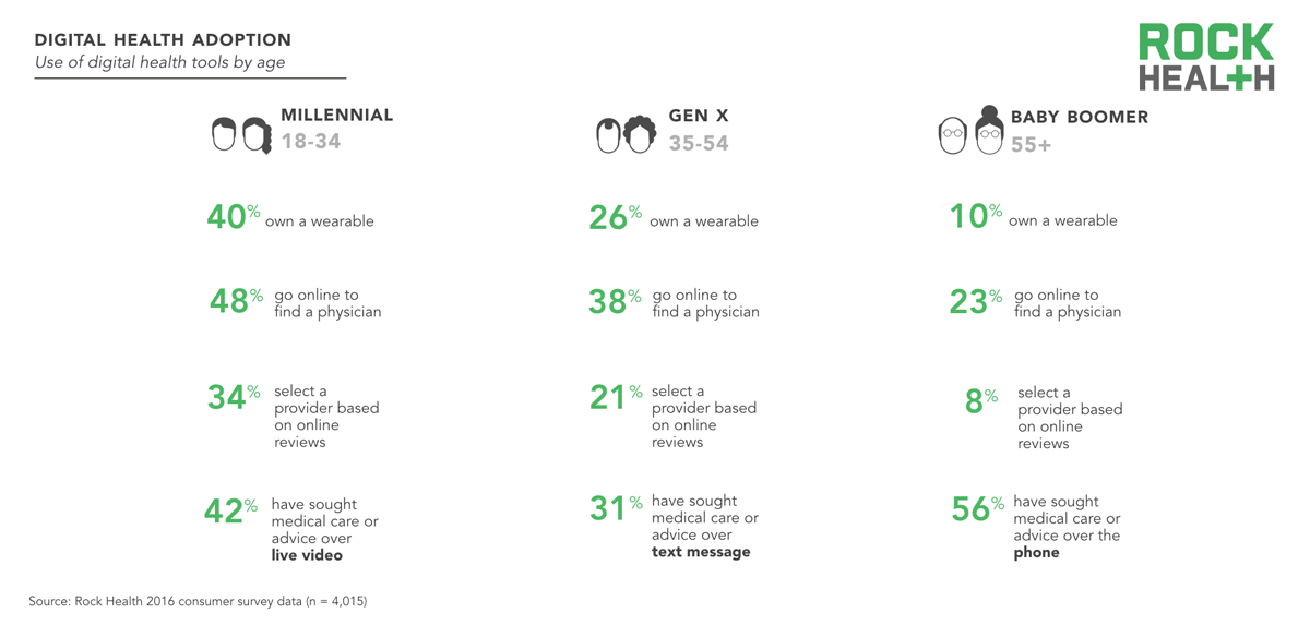 38.百分之四十二的千禧一代使用同步视频远程医疗,相比之下, Gen Xers数据只有25%,婴儿潮一代不到5%。