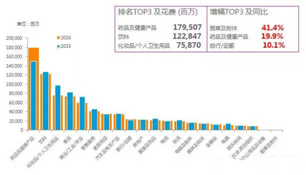 2016年的广告投放市场较去年出现较大转变:TOP6行业虽然排名没有变化,但仅有药品及健康产品行业出现近20%的增长,饮料、化妆品/个人卫生用品、食品、商业/工业/农业和零售服务行业都有不同幅度的花费下降,其中化妆品/个人卫生用品下降22%,幅度最大。中游行业中,家居用品行业超越去年的汽车及有关产品行业,排名第七。服装及饰品行业跌出前十位榜单,房地产行业维持不变。照往年表现,12月广告投放市场都会再掀一轮小热潮,各大行业能否出现转机只剩12月成绩便可定论。