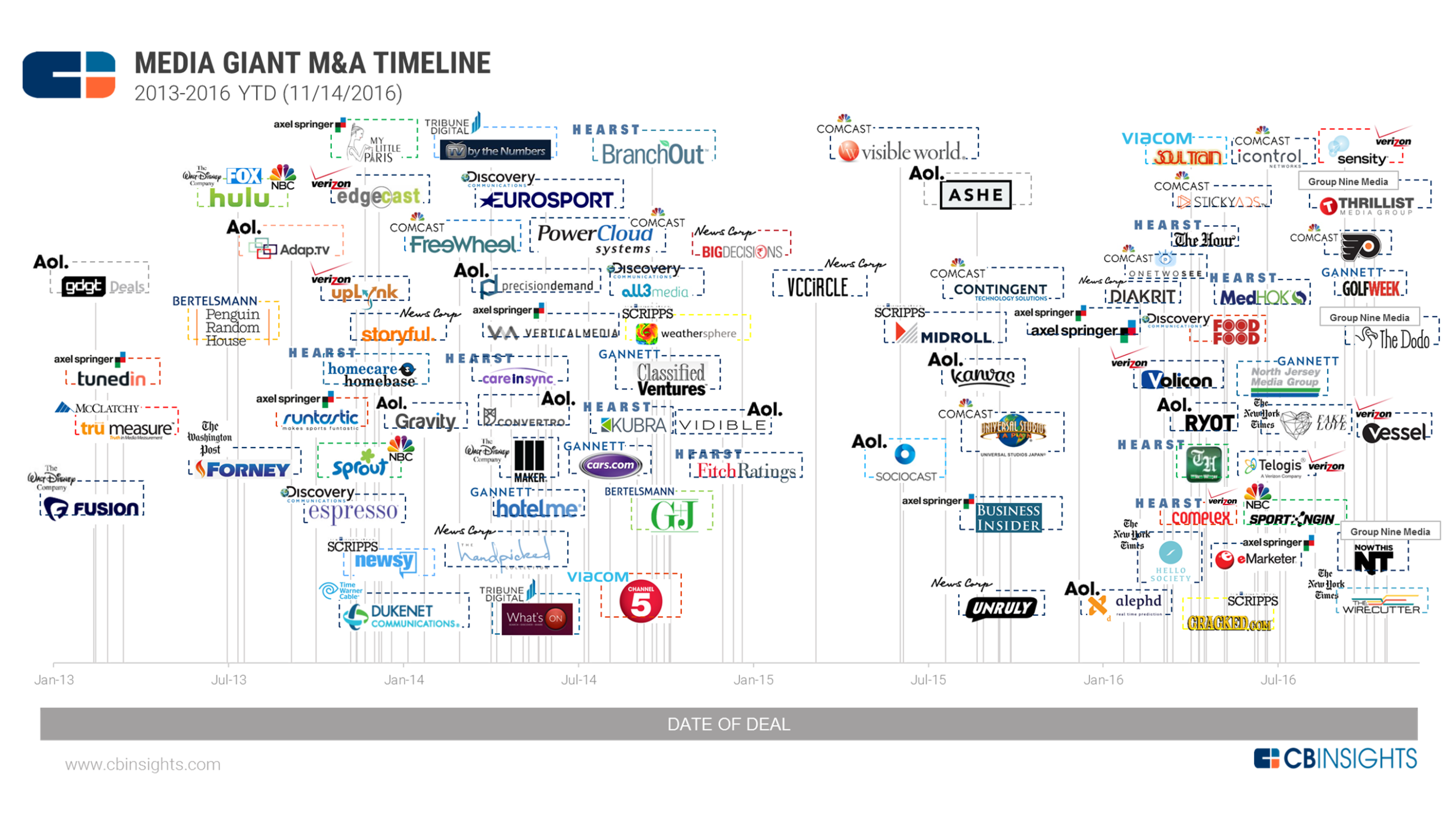 2016年媒体行业进一步整合,Verizon正在收购Yahoo,4家网络媒体合并成立了Group Nine Media,NBC并购DreamWorks Animation(38亿美元)等等。