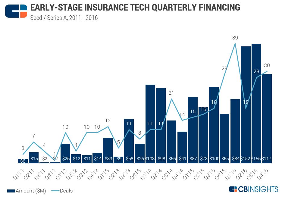 根据CB Insights的数据,2016年保险科技领域投资交易活动再创纪录。