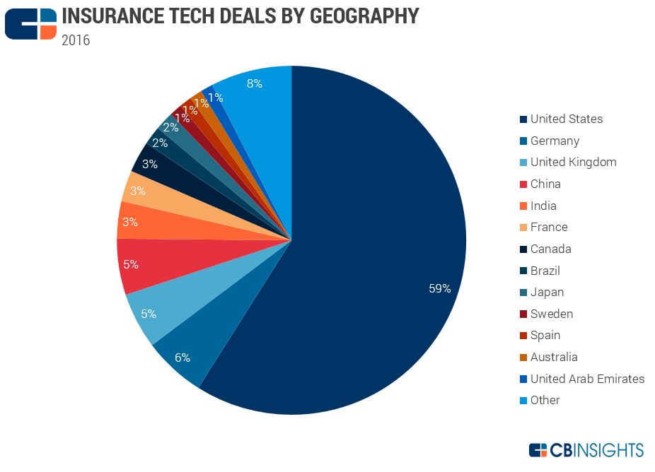 从各国来看,2016年美国企业占保险科技领域投资交易的59%,德国、英国和中国企业所占份额都超过5%。