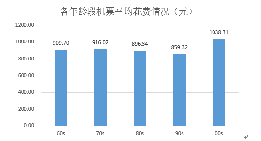 这从机票的花费上也能看出端倪。统计显示,00后们花钱比爷爷奶奶叔叔阿姨们都要多,机票的平均花费达到1038元左右。最精明的莫过于90后们,平均机票的花费情况是859元,比00后少了170多元!