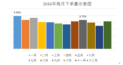 根据统计,2016年去哪儿平台一共为旅客提供了41亿次的机票搜索。其中仅无线端就达到33亿人次,平均每天帮助近千万人次用手机搜索机票价格。下图是2016年去哪儿网用户每月的下单量示意图。