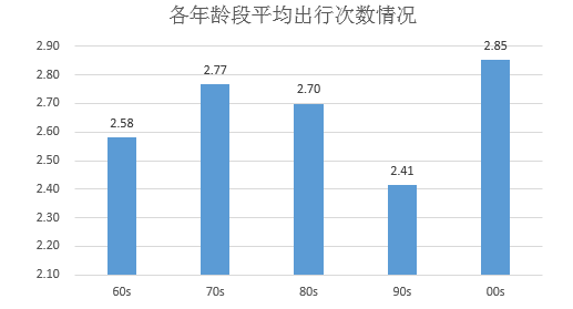 2016年,从各年龄层人群出游频次上看,00后的熊孩子们出去玩的次数最多,平均出行次数达到2.85次。