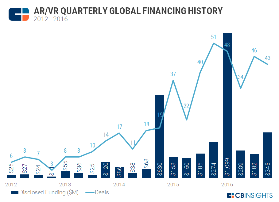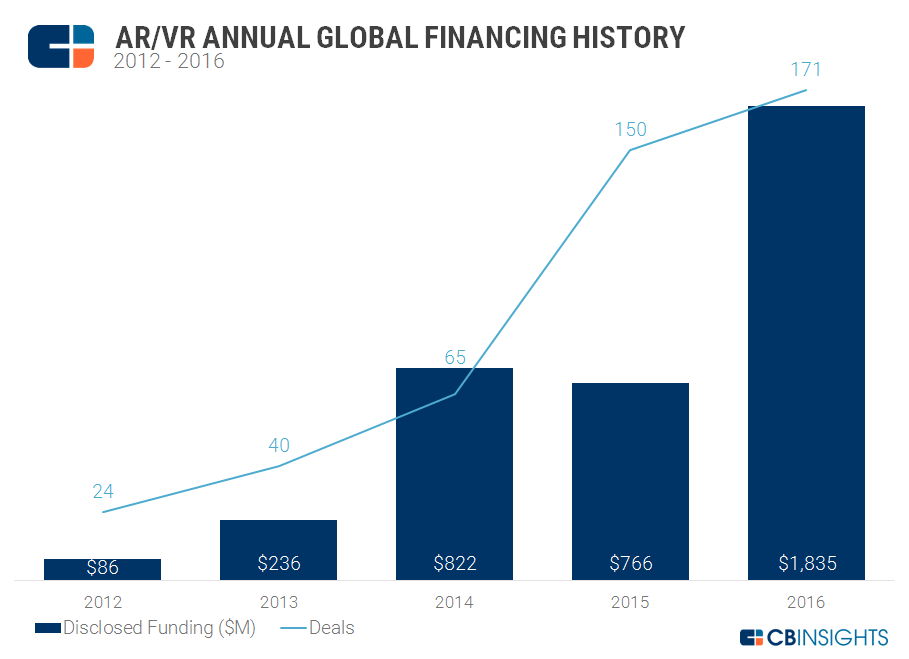 2016年AR/VR领域共获得18亿美元投资,和前一年比增长140%;投资交易171宗,和2015年比增长14%。