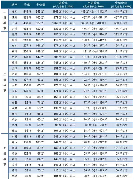 基于套总价、结合成交量,我们将30个城市不同层次的楼盘分为三类:中低价位、中高价位、高价位,具体划分方式为:首先根据套总价对所有新房楼盘进行降序排列,成交量占当地前10%的属于高价位楼盘,10%-40%属于中高价位楼盘,后60%属于中低价位楼盘。