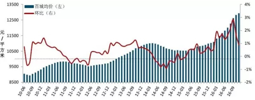 图:2010年6月至2016年11月百城住宅均价及环比变化