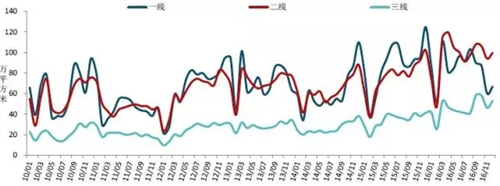 二线城市成交量增长较为明显。2016年二线代表城市月均成交面积约96万平方米,同比增长26.8%,平均规模超过一线城市。分季度来看,一季度南京、天津、杭州、苏州成交量同比增幅尤其显著,随着市场热度逐步向其它二线城市转移,三季度济南、郑州成交量同比大增九成以上;政策调控出台有效抑制投资投机性需求入市,南京、苏州、杭州、济南市场快速调整,10-11月成交面积同比显著下降,其中苏州同比降幅扩大至68.5%,天津、郑州等地成交面积同比增幅亦大幅收窄。