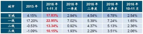 注:不同城市楼盘成交数据覆盖区域不同,如北京、上海等地包括所有区县,重庆、廊坊等仅覆盖主城区,不包括下辖县市;北京不含自住型商品房;不同城市成交数据的物业类型均不含保障性住房。具体覆盖区域和物业类型请参考CREIS中指数据详细说明。2016年数据均为1-11月统计数据,下同。