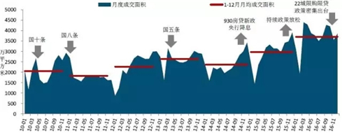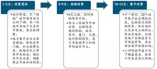 2016年房地产政策经历了从宽松到热点城市持续收紧的过程:两会提出因城施策去库存,但随着热点城市房价地价快速上涨,政策分化进一步显现。一方面,热点城市调控政策不断收紧,限购限贷力度及各项监管措施频频加码,遏制投资投机性需求,防范市场风险;另一方面,三四线城市仍坚持去库存策略,从供需两端改善市场环境。同时,中央加强房地产长效机制建设,区域一体化、新型城镇化等继续突破前行,为行业长期发展积极构建良好环境。