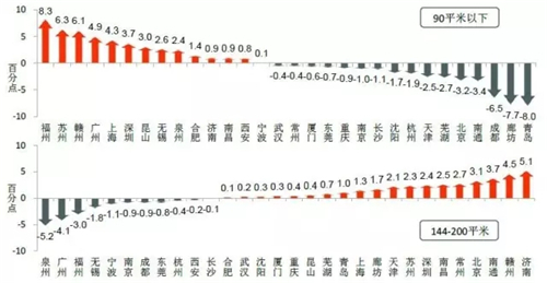 图:2016年30个代表城市不同面积段住宅销售套数占比较2015年变化
