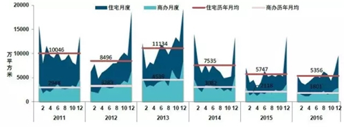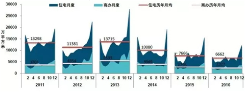 图:2011-2016年全国300个城市住宅和商办用地成交面积