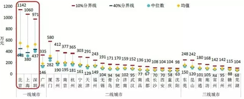 图:2016年30个城市楼盘套总价前10%、前40%分界线、中位数和均值