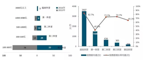 图:2016年百亿房企各阵营数量、销售均值及增长率