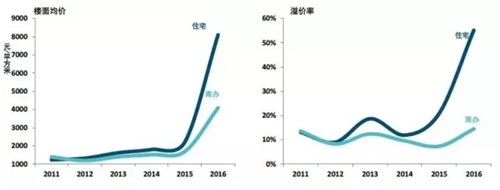 图:2011-2016年全国300个城市住宅和商办用地成交楼面均价及平均溢价率