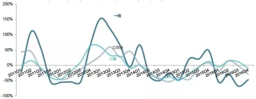 与价格上涨相伴随的,是全年成交规模的持续放大。应该注意的是,在此轮市场成交放量的过程中,各类城市分化运行的特点愈发显著:在土地供应越来越少的一线城市,新房成交量已难以跟上价格攀升的节奏,把更多的市场空间留给了二手房,市场供应主体发生了巨大改变,未来市场运行的复杂性陡增。相比而言,二线城市的新房市场空间仍然宽广,市场热度在不同城市间不断传导,未来将持续成为众多开发商争夺的焦点。而三四线城市的波动增长,则给了市场更多的信心。毕竟,大部分三四线城市的成交更源于刚需和改善需求,此类需求较具持续性,也是稳定2017年市场成交的基础。但从整体来看,2016年房地产市场交易的高基数,为2017年市场成交变化带来了压力。