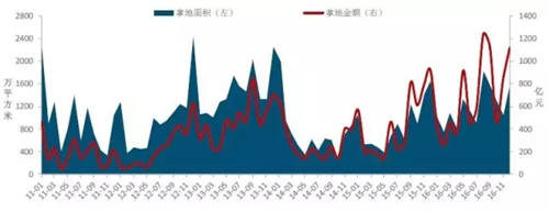 图:2011年-2016年20家代表企业拿地面积和金额情况