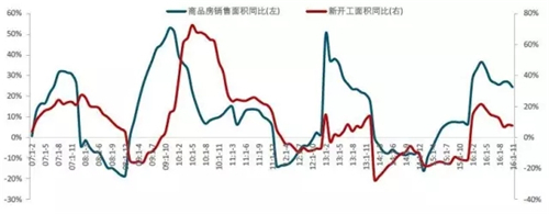 图:2007年至今商品房销售面积、房屋新开工累计同比增速对比