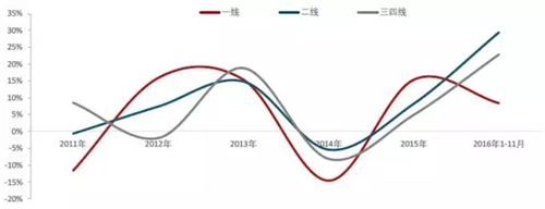 从各级城市来看,2016年1-11月各级城市住宅价格均呈上涨态势,与2015年全年相比,一线城市涨幅扩大,二三线城市止跌转涨,部分城市涨幅显著。一线城市2016年1-11月房价累计涨幅高达22.95%。调控政策出台后,10-11月一线城市上涨幅度趋缓,较三季度收窄5.59个百分点,在各线城市中最为显著。二线代表城市1-11月房价累计涨幅达13.34%,其中一至三季度房价涨幅持续扩大,四季度调控政策出台后,近三分之二的二线代表城市房价涨幅收窄。三线代表城市1-11月房价整体变化较为稳定。