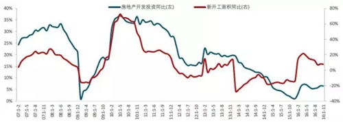 图:2007年至今开发投资额、新开工面积累计同比走势