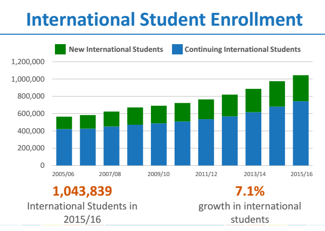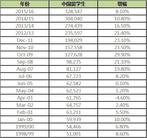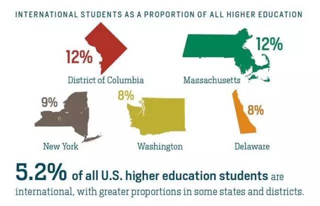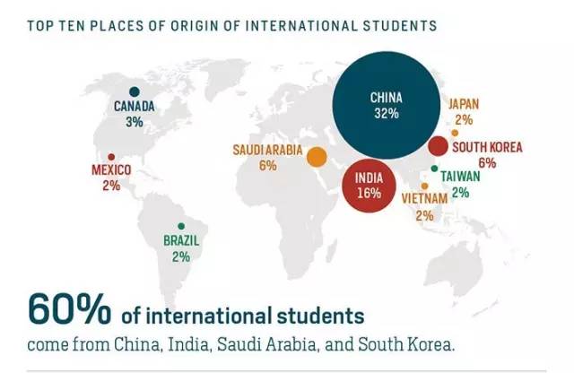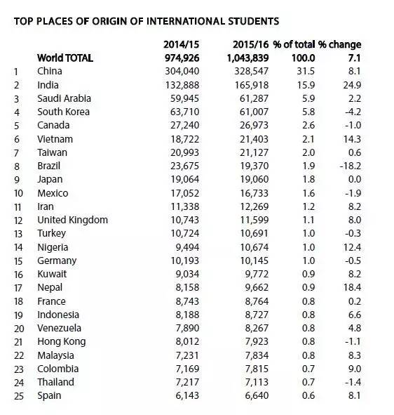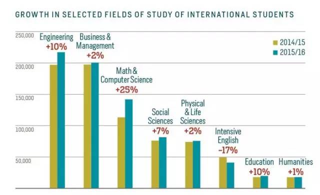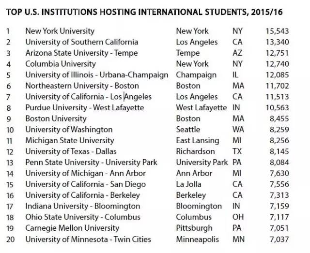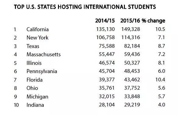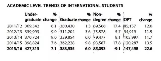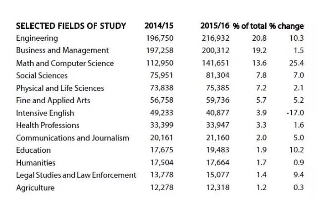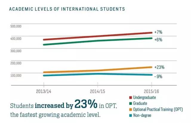 IIE:2016年门户开放报告 美国国际教育协会IIE11月14日发布的《2016年门户开放报告》披露了2015-2016年在美留学的国际生最新数据。数据显示,2015/2016年留美人数再创新高,首次突破一百万,达到1043839人,比上一学年增长7.1%。 中国方面的数据 2015-2016学年,中国依旧是美国最大的留学生生源地(中国已连续7年是最大生源国),同比增长8.1%,达到328547人,占美国留学生总数的31.5%。 这32万多中国学生,有41.3%是本科留学生,37.5%是研究生留学,15.9%是OPT(比去年增加21%),5.3%是其他。这也是连续第二年,赴美读本科的中国学生人数多于读研学生。 2015-2016学年,中国留学生给美国经济贡献了114.3亿美元。 整体数据解读 数据显示,留学的国际学生人数持续增加,2015/2016年已经达到1043839人,比去年(974926人)同比增长7.1%,国际留学热度持续增加,热度不减。 这一百多万国际生占美国高等教育学生总数的5.2%。其中哥伦比亚特区、马萨诸塞州的国际生比例高达12%。纽约的国际生比例占9%。 这100多万留美学生其中有32%来自中国,16%来自印度。韩国和沙特阿拉伯的留美人数各自占留学生总数的6%。也就是说,仅这四个国家的留美学生人数就达到了美国留学生总数的60%。 这些学生给美国经济做出了358亿美元的贡献(2014/2015的数据),其中67%的学生是自费留学,由个人或家庭提供留学费用。17%是靠美国高校提供的奖助学金留学。 以上两张图显示的是美研、美本和OPT的人数及变化。我们可以看出,美本留学人数超过美研,增幅也超过美研。不过和去年相比,OPT人数增长最快,达23%。 和上一年相比,2015-2016年,学习工程的留美学生人数增加了10%,学商科管理的多了2%;数学和计算机科学专业的留学生人数增加了25%。除了英语强化课,学习其他科目的学生都有不同幅度的增长。 留学生最热衷选择的专业TOP5依次是工程、商科及管理学、数学和计算机科学、社会科学、物理和生命科学。 留学生人数最多的10大美国高校分别是纽约大学、南加州大学、亚利桑那州立大学、哥伦比亚大学、伊利诺伊大学香槟分校、东北大学、加州大学洛杉矶分校、普渡大学、波士顿大学、华盛顿大学。 国际生大多集中在加州、纽约州和德克萨斯州。每三个留学生就有一个在以上这三个州区学习。2015/2016年,在加州留学的国际生人数超过14.9万,比上一学年增长10.5%。 更多阅读:美国国际教育协会:2019美国门户开放报告美国国际教育协会:2018门户开放报告IIE:2017年秋季美国国际留学生调查报告IIE:2020美国门户开放报告2015年美国门户开放报告:留学生就业形势分析世界各城市60平米房屋成本趣味数据:分析了6.5万字的歌词,看到了这样的周杰伦品质生活下的中国食品饮料市场亚马逊跨界女性内衣市场能靠谱么?研究显示只有一部分人能够经过创伤却变强途虎养车:2018中国汽车用户线上养护行为报告百度外卖发布十一大数据 异地点单量激增电资办:2016年5月9-15日全国电影票房周报阿里数据:2018年天猫博物馆文创数据报告可能用于记忆控制的新机制