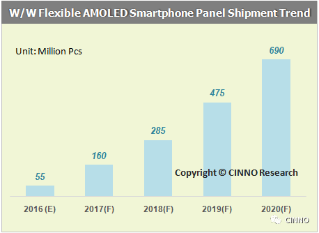 根据CINNO Research全球季度手机面板出货量监测统计分析报告显示,2017年柔性AMOLED手机面板出货规模有望翻三番提升至1.6亿片,至2020年柔性AMOLED手机面板的年复合成长率将达88.2%。
