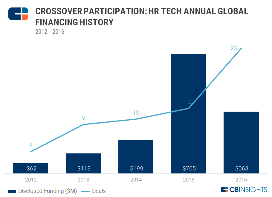 2016年跨界投资者参与了23宗HR科技领域投资交易,和2015年比增长一倍;投资3.63亿美元,仅是2015年投资额(7.05亿美元)的一半左右。