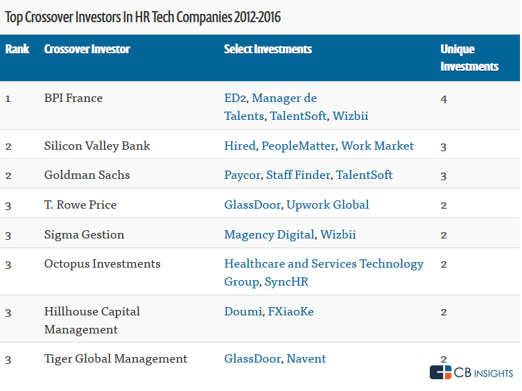 其次是硅谷银行和Goldman Sachs,分别投资了3家HR科技企业。