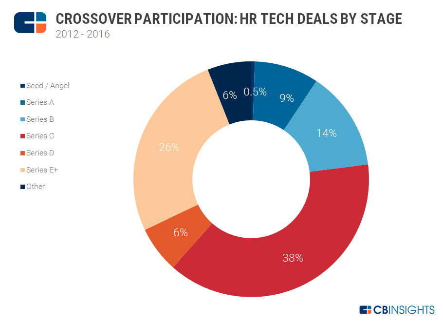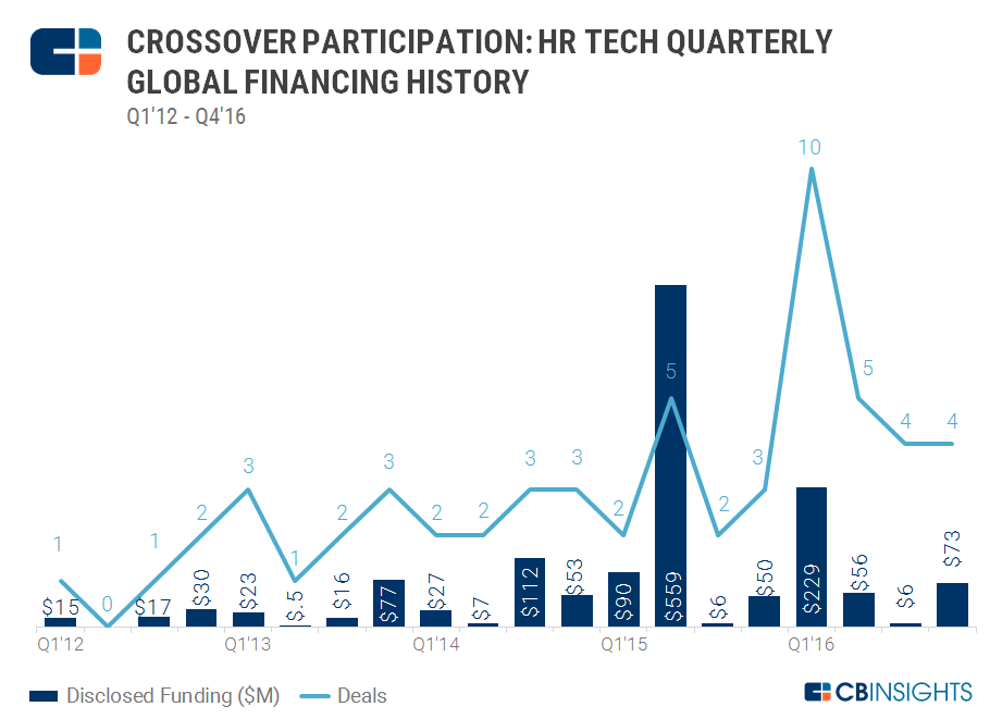 跨界投资者参与的规模最大的HR科技领域投资包括,2015年第二季度Zenefits获得5亿美元投资;2014年第三季度Paycor获得1.1亿美元C轮投资(Goldman Sachs参与投资);2016年第一季度SnagAJob获得1亿美元投资。