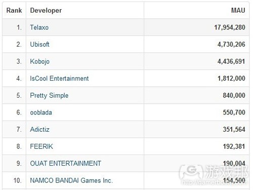 据socialgamesobserver报道,Kobojo过去一直是法国最大的社交游戏公司,但本周MAU和DAU居于领先地位的是Telaxo,Kobojo退居第二位,育碧则排名第三。