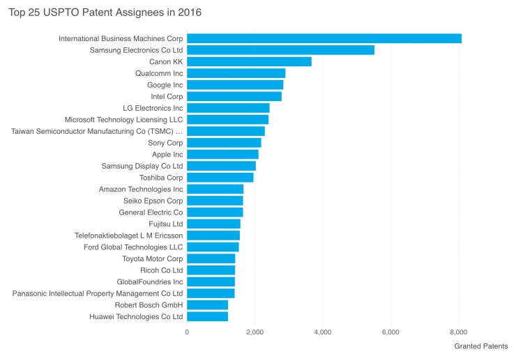 IBM在2016获得的专利比2015年多10%,而且还没有一家公司能像IBM那样一年有超过7000项专利。但其它公司的发展速度更快,比如第6位的英特尔专利数比去年涨了34%,达到2784项,而第14位的亚马逊则增长了46%,达到1662。你们关心的苹果排在第11位,专利数是2102。