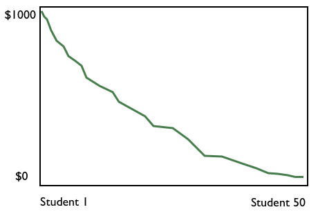 在很多大学的微观经济学课程里,都会有这样一个练习题:老师假设让学生去夏威夷旅行,并问他们愿意为这趟旅行支付多少。通过收集学生们写下的答案,老师们会制作出下面这样的图: