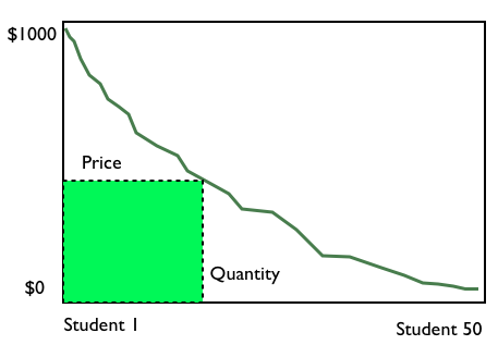 其中Y轴是学生们愿意支付的价格,X轴是支付价格从高到低的学生。这是经济学上最基础的需求曲线。现在,让我们来想象一下,如果你是这家旅行社的老板,或者更简单一点,假设你已经购买了这趟旅行,因此你的边际成本为零。此时设置什么样的价格最优呢?如果你将价格设置在500美元,那么那些愿意出500美元以上的学生会购买这趟旅行,而其它部分不会。
