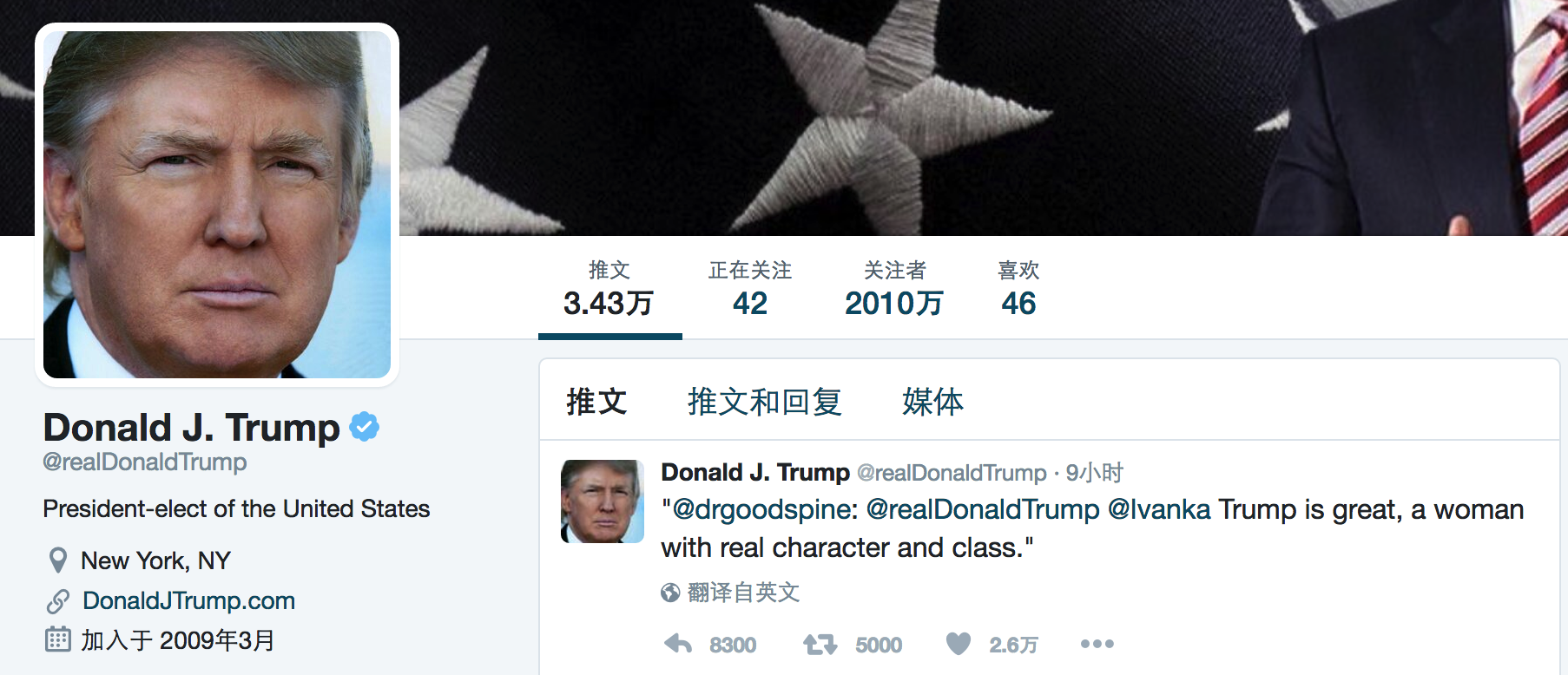 美国总统当选人特朗普在Twitter已经拥有2000万追随者。
