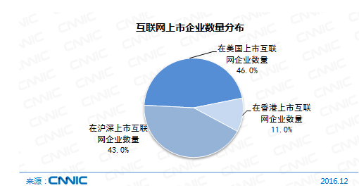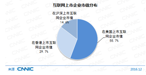 截至2016年12月底,我国境内外互联网上市企业 数量达到91家,总体市值为5.4万亿人民币。在美国上市的互联网企业总市值最高,占总体的55.7%;其次为在香港上市的互联网企业总市值,占总体的29.7%;沪深两市的互联网企业总市值占总体互联网企业市值的14.6%。