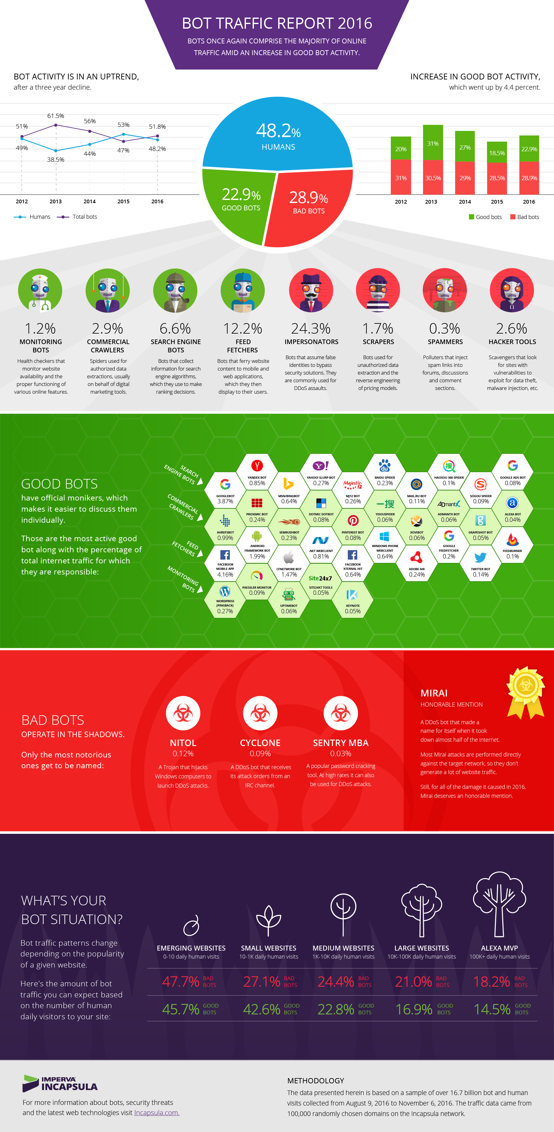 根据Imperva Incapsula公司公布的2015年Bot Traffic Report(bot流量报告),人类五年来首次线上流量超过机器人,占全部线上流量的51.5%,而在2013年的时候仅仅为38.5%。而人类流量占多的情况比较短暂,在最新公布的2016年bot流量报告中显示,人类在线流量降到了48.2%,bot流量达到了51.8%。