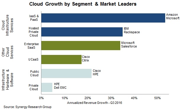 Synergy Research Group发布了2016年第三季度六大云服务和基础设施市场的最新数据,供应商收入达到1480亿美元(Q4 2015-Q3 2016),较前一年增长25%。IaaS & PaaS服务增长速度最快(53%),其次是托管私有云基础架构服务(35%)和企业SaaS(34%)。