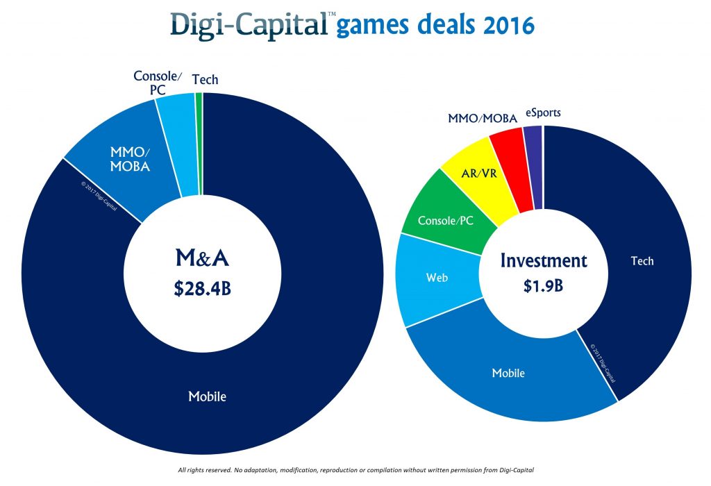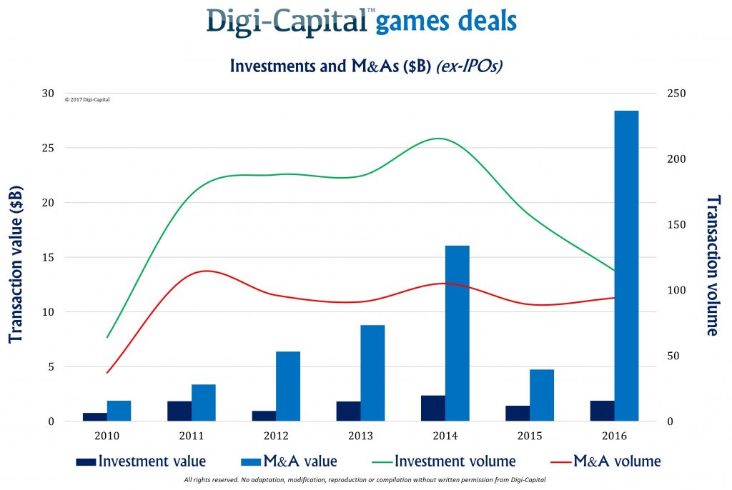 Digi-Capital的“2017年游戏报告”显示,2016年游戏行业交易额达303亿美元,其中游戏并购交易额284亿美元,游戏行业投资额19亿美元。