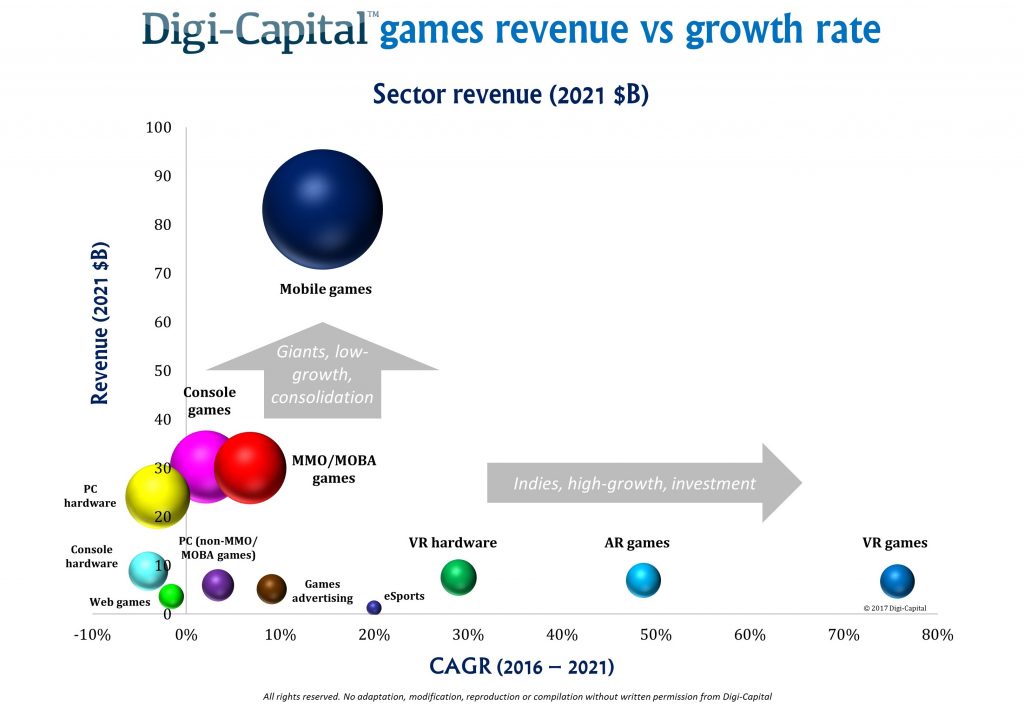 主机游戏和MMO/MOBA的收入都不如移动游戏,而且增速也在放缓,预计到2021年收入分别在300亿美元左右。因此,到2021年移动游戏将成为游戏市场最大的部类。PC和主机硬件将停止增长,到2021年这两者的收入总和在300亿美元左右。