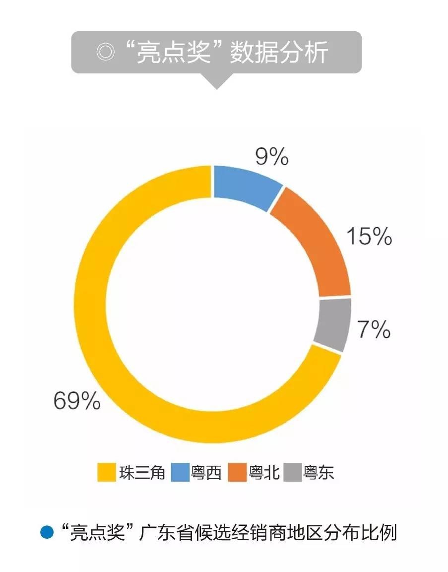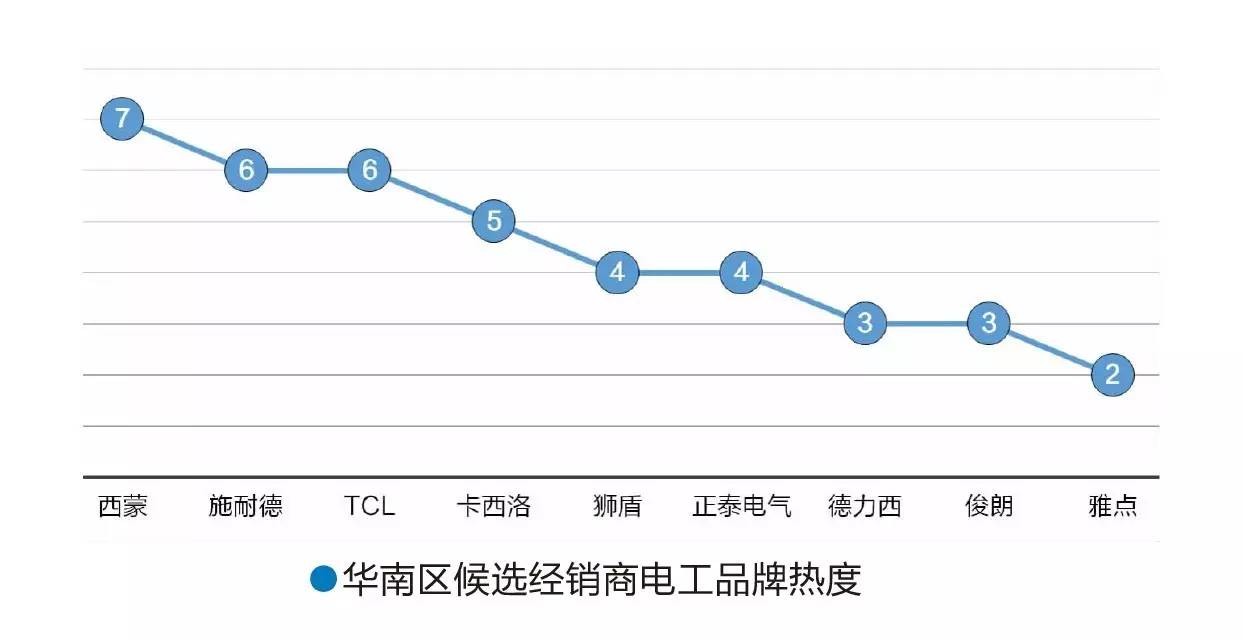 华南区候选经销商的代理品牌中,出现频率最高的是飞利浦、雷士、欧普;其次三雄极光、佛山照明、钜豪,也占到了较大的比例。在此次调查中可以从侧面看出,相对于其它品牌,飞利浦、欧普、雷士等在华南区渠道方面铺设得比较完善,基本覆盖了华南三省各个地区。