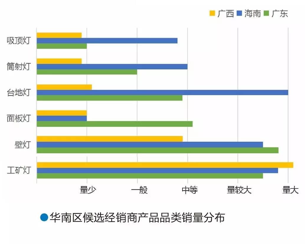 广东、广西、海南三省的共同特点是,吸顶灯、筒射灯仍然是消费主力品类,其中海南省中,流通量较大的还有面板灯、壁灯和工矿灯等在其他省份中流通量较少的品类。数据说明于华南区,家居照明、商业照明仍然是主力。