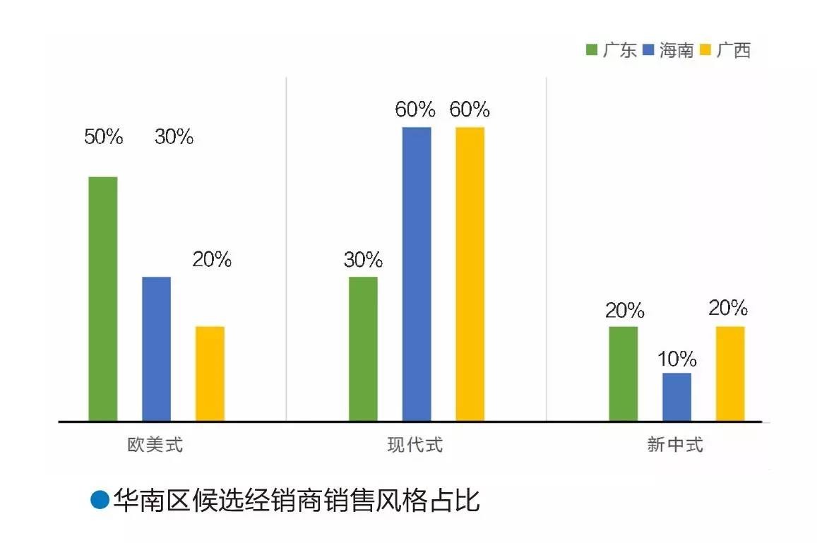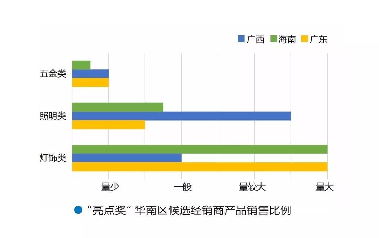 五金类在所有候选经销商中的销售比例都是最低的,主要还是照明和灯饰。广东省和海南省灯饰类占这些经销商的销售中占到70%,广西省的照明类产品则占60%,灯饰类只占30%。